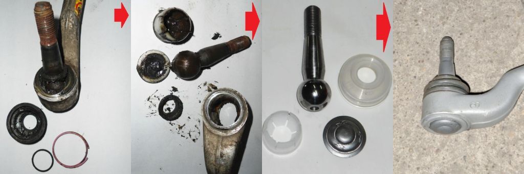 Качественная реставрация шаровой заключается в её полной разборке (шарнира шаровой опоры, рулевого наконечника или тяги, плавающего сайлентблока и стойки стабилизатора), грамотной дефектовке, замене всех изношенных деталей на новые.